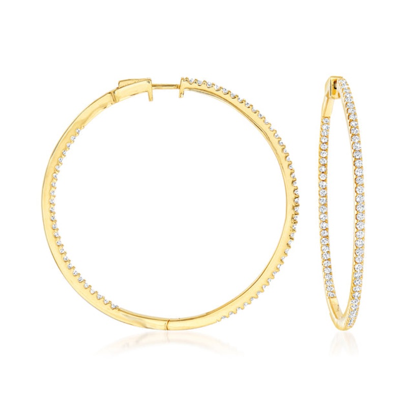 Ross-Simons is the authority on luxury classics. Our hoops are the star of the show! Gleaming in 2.00 ct. t.w. round brilliant-cut diamonds from the inside-out, these earrings are perfect for practically any ensemble or event. A polished 18kt yellow gold sterling silver setting makes them affordable, and just as glamorous as ever. Hanging length is 1 7/8″. Hinged post, Diamond hoop earrings. Each Ross-Simons item arrives in a fine jewelry presentation box. Shop Ross-Simons jewelry risk-free as all items include a 30-day, 100% money-back guarantee.